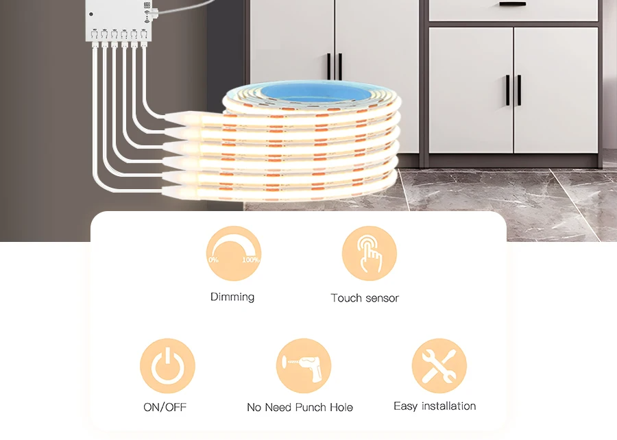 Illuminate your space effortlessly with the Touch Under Cabinet Dimmable COB LED Strip Light kit. This 1-meter white 6000K light strip set includes 6 pieces designed for seamless under-cabinet or bookcase installation. Featuring COB technology for smooth, bright lighting and a convenient touch dimmable function, it lets you customize brightness to suit any mood or task. Enhance your home or workspace with clean, efficient lighting that combines style and practicality.
